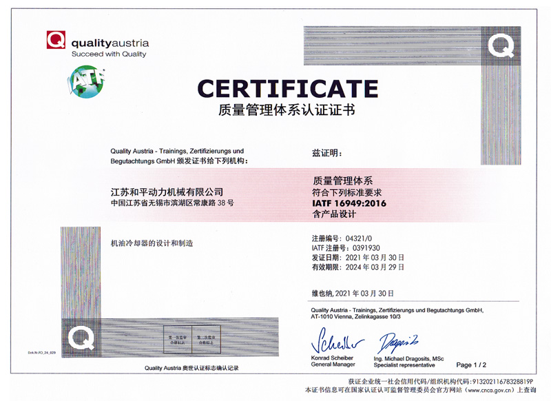 憑借領先的研發理念和先進的制造技術,和平先后參與制定了《JB/T 6003.1—2014?內燃機 機油冷卻器第1部分:板翅式機油冷卻器 技術條件》《JB/T 10505- 2016 內燃機 機油散熱器 技術條件》《JB/T 0436 - 2013 內燃機 機油冷卻濾清模塊》《JB/T 6003.3—2016 內燃機 機油冷卻器第3部分:傳熱性能試驗方法》系列國家行業標準。